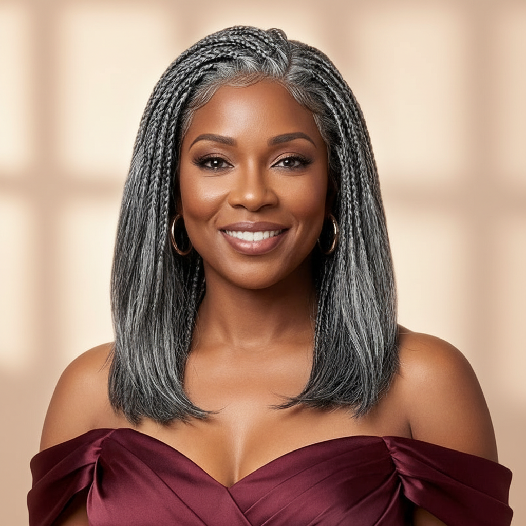 Salt & Pepper Boho Braided Straight 13x4 Full Frontal Human Hair Wig – Half Cornrow, Half Loose Style for Women