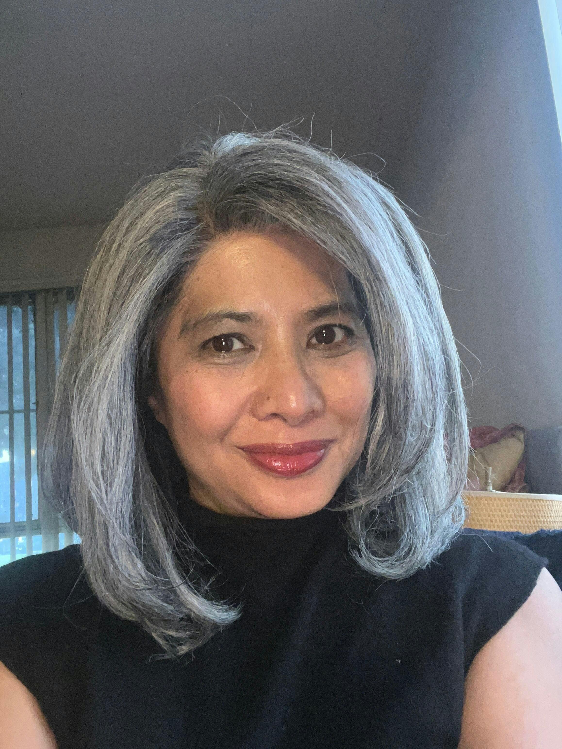- Hair Color : Standard Salt & Pepper with subtle lighter gray money pieces at the front for a soft, face-framing effect.