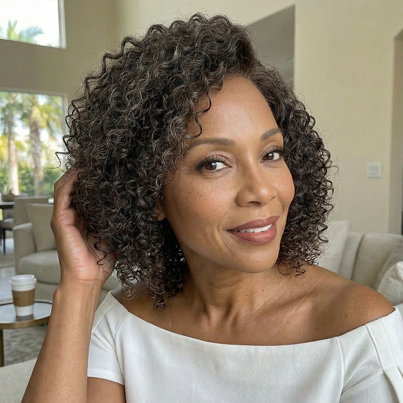 Women who love soft, bouncy Jerry curls and a natural-looking hairstyle. The beautiful blend of dark brown and gray tones creates a realistic, dimensional look that feels elegant and timeless.