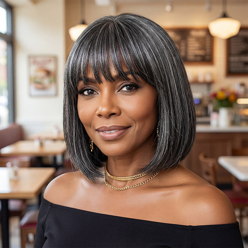 Renee | Chic Salt & Pepper Straight Bob Wig With Bangs Real Glueless Human Hair Wigs For Women