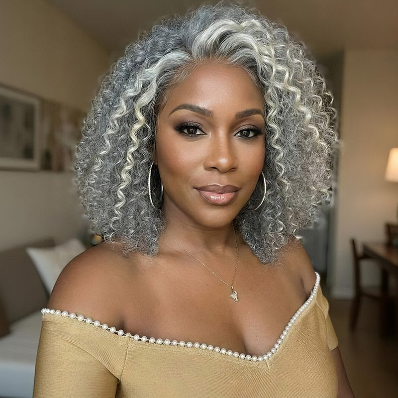 Zuri | Seniors Salt And Pepper Jerry Curly Bob Real Human Hair Handmade 5x5 HD Lace Wigs For Mom