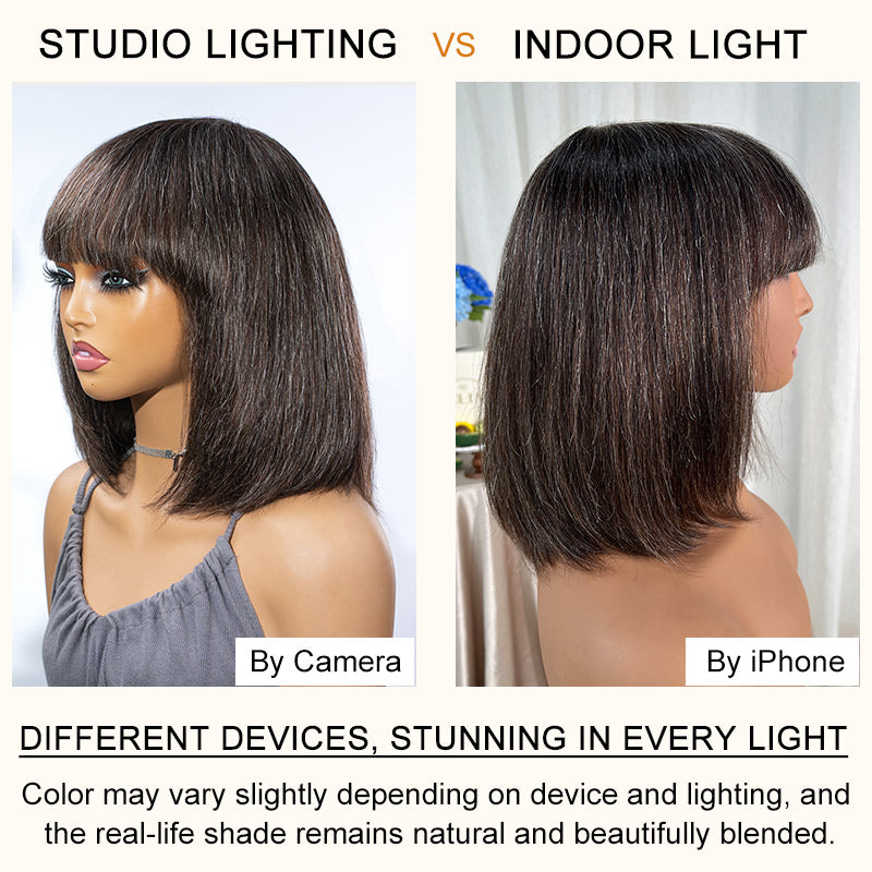 - Hair Style: Dark Brown Mixed Gray Straight Bob Wig with Natural Soft Bangs – Sleek, modern short bob style designed for a natural and elegant everyday look