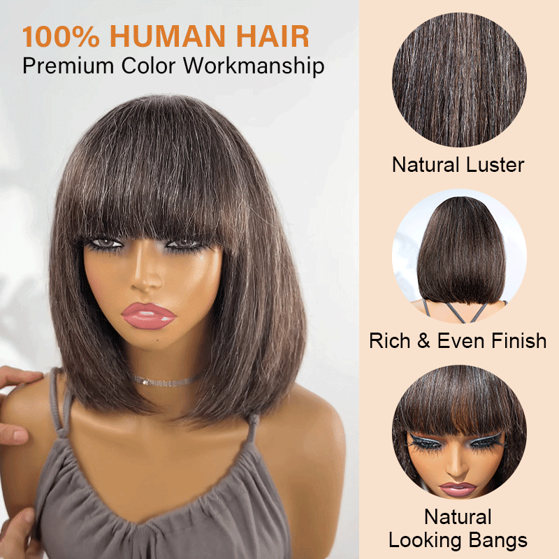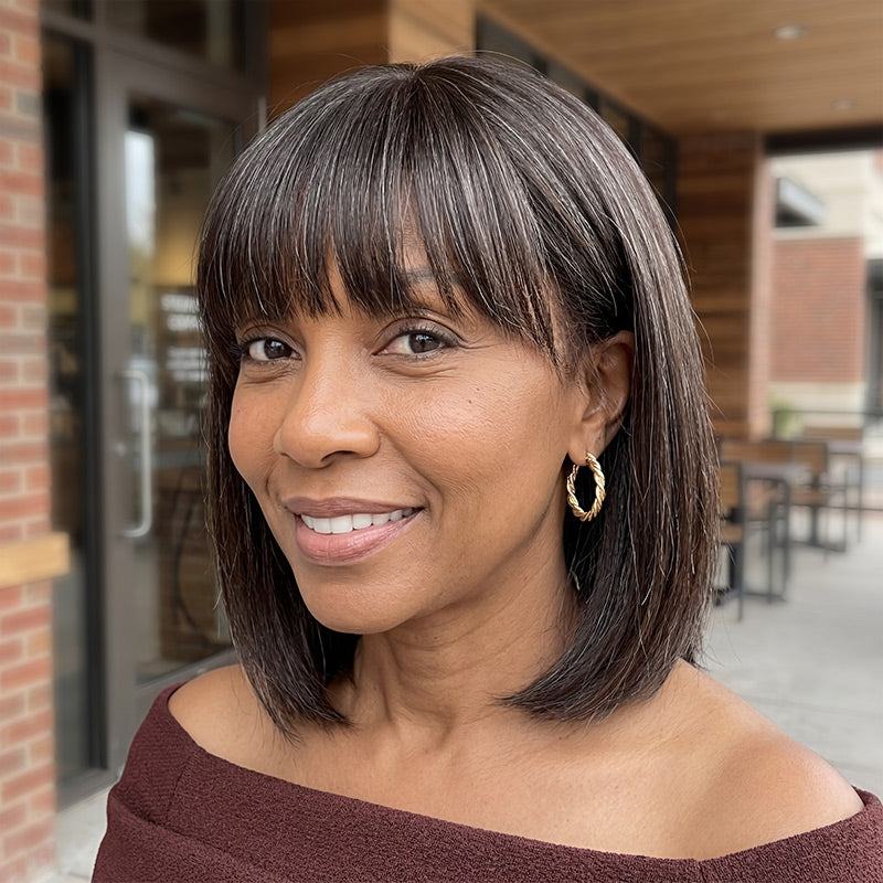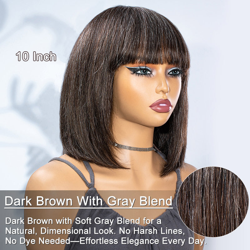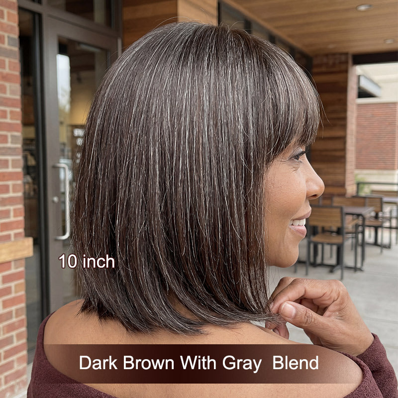 Shelia | Natural Dark Brown Mixed Gray Straight Bob Wig with Bangs | 100% Human Hair Short Bob Glueless Wig Natural Look