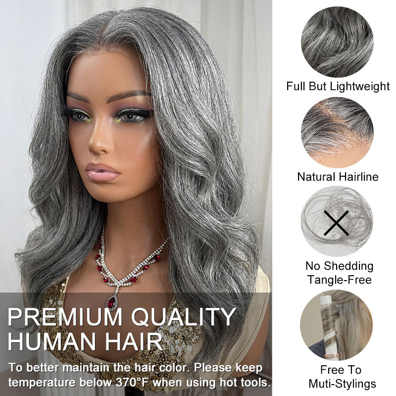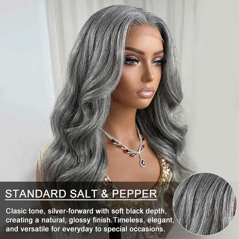 Sienna | Silver Luxe Gray 13x4 HD Lace Full Frontal Wig Body Wave Human Hair Salt And Pepper Wig For Older Women