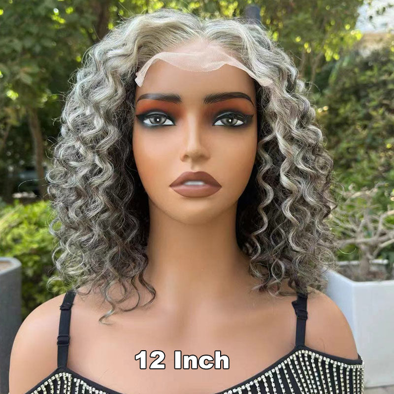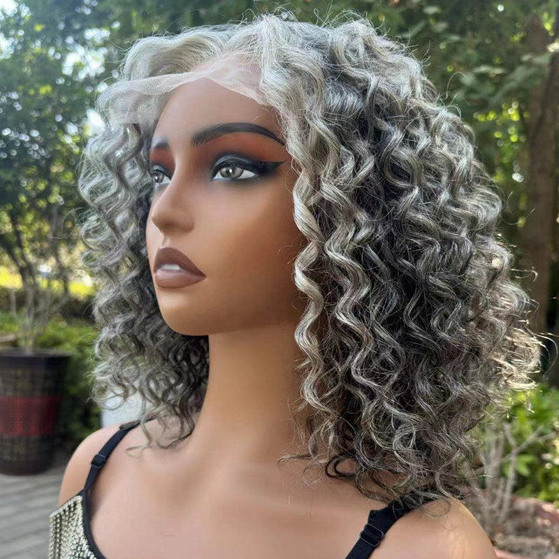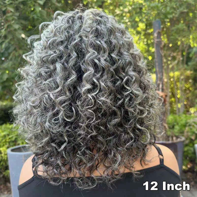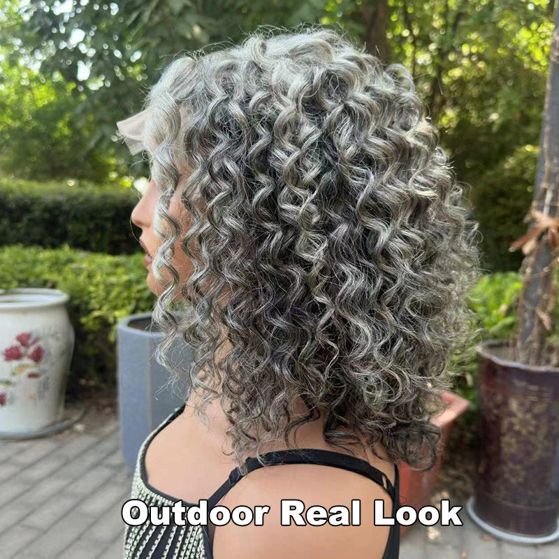 Silver Gray Curly Bob Water Wave Human Hair Salt & Pepper 5x5 HD Lace Wigs For Women